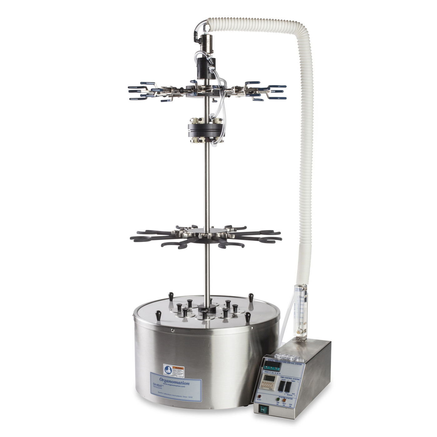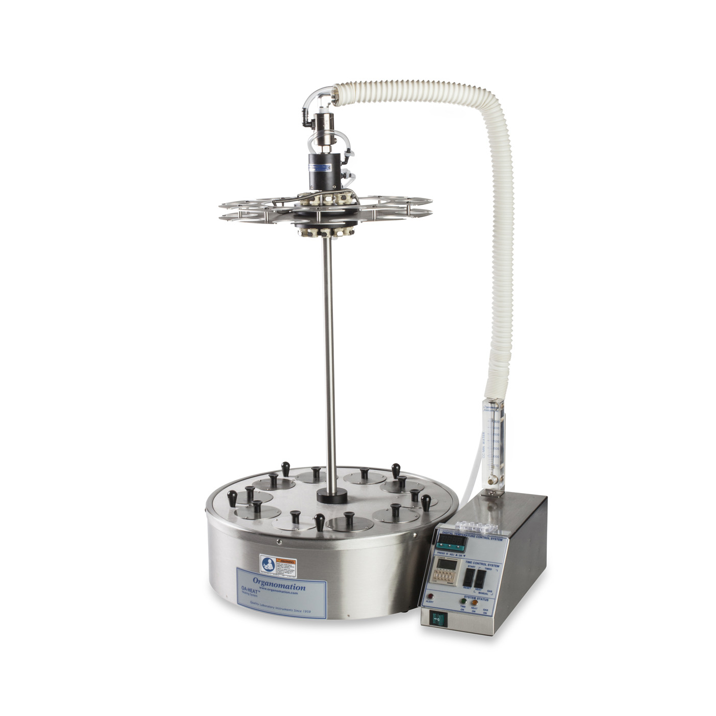 To conserve valuable bench space, all samples are arranged in a circle and the instrument rotates allowing each sample to be accessed from the front. Individual condensers are connected to the centrally located water manifold through quick disconnect fittings. The water supply and drain manifolds have one water supply line in, one drain line out, allowing the instrument to rotate freely without tangling the tubing